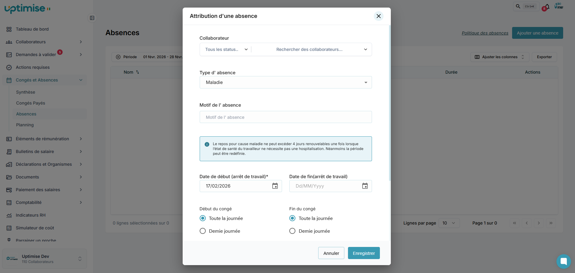 Type d'absence : Choisissez le type d'absence (maladie, événement familial, etc.).