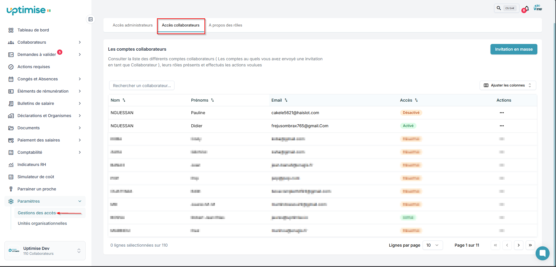 Un tableau affiche la liste des collaborateurs avec Nom, Prénom, Email, Accès et une Action disponible.